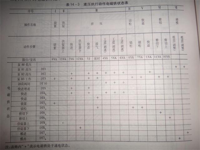 XJ630型銅鋁材擠壓機(jī)的液壓系統(tǒng)工作原理圖如14-3所示,表14-3為該機(jī)液壓執(zhí)行動(dòng)作的電磁鐵狀態(tài)。